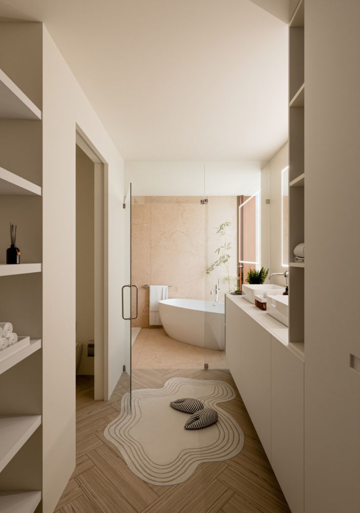 Paredes: Branco mate. Rodapés em madeira lacada cor da parede