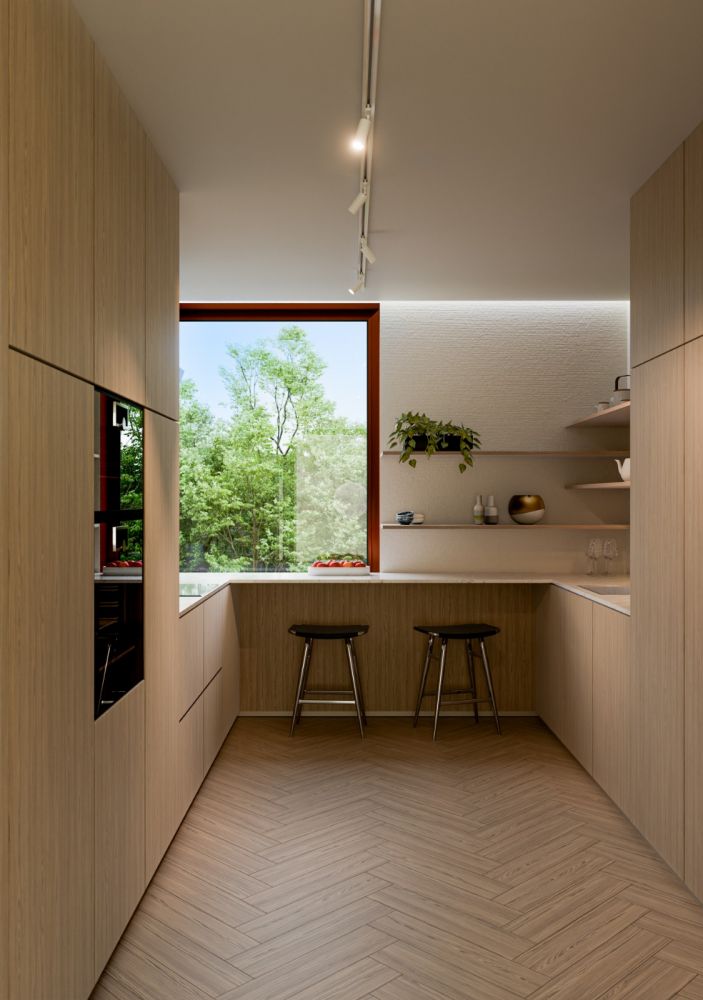 Cozinha MDF hidrófugo lacado branco mate com contraste carvalho.